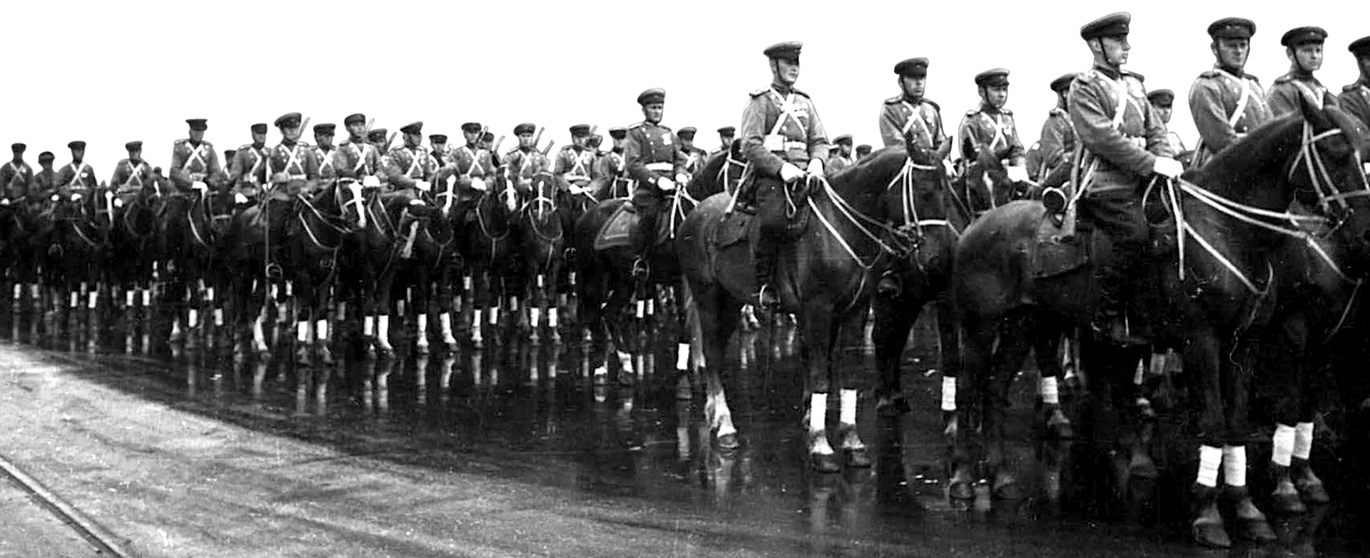 Под звуки песни «Полюшко-поле» по Красной площади проходят конники сводной