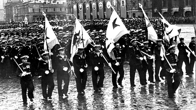 На площадь вступают войска Московского гарнизона во главе с командующим